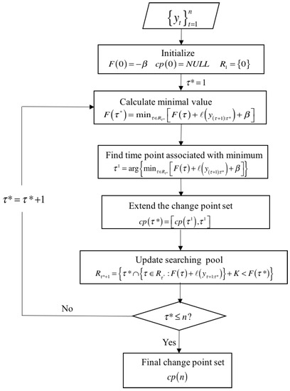 To improve the computational efficiency of the optimal partitioning approach, a PELT method [26] is proposed to prune s that can never be optimal at each iteration based on the assumption that there exists a constant K such that for all ,
