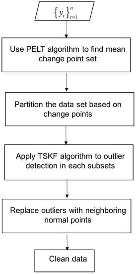 To overcome the challenge of outlier detection in dynamic data sets with multiple operating points, we propose to combine the PELT with TSKF, and an integrated methodology overview is shown in Figure 2. For each variable , we first use the PELT algorithm to find mean change points that segment the data and then apply TSKF to outlier detection within each subset bracketed by change points. Finally, we replace the outliers with neighboring normal points.