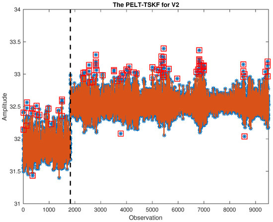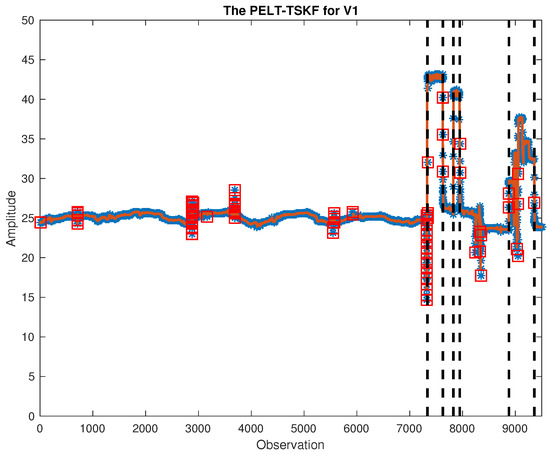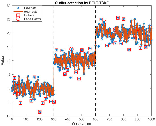 We provide an illustrative data set with , , . Figure 3 and Figure 4 show that the PELT algorithm can easily find two mean shifts at the 300th and 600th sample points marked by black dashed lines in both figures. In addition, additive outliers detected are highlighted by red squares, and we can see that the PELT-TSKF method is able to detect more additive outliers than the PELT-GESD identifier because there are more red squares in Figure 3 than in Figure 4. However, as indicated by the red circles shown in Figure 3, the PELT-TSKF cannot shield normal observations from swamping effects caused by outliers and leads to a few mis-identified instances—for example, the 21st point after an outlier at the 20th, and the 741st point after an outlier at the 740th time point are both mistaken for outliers because of previous anomalies.