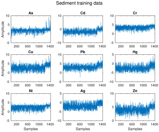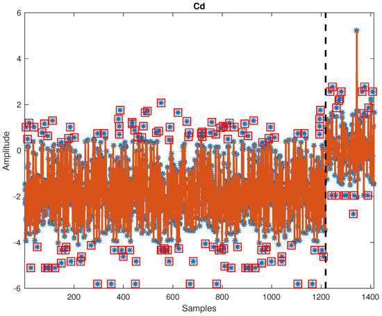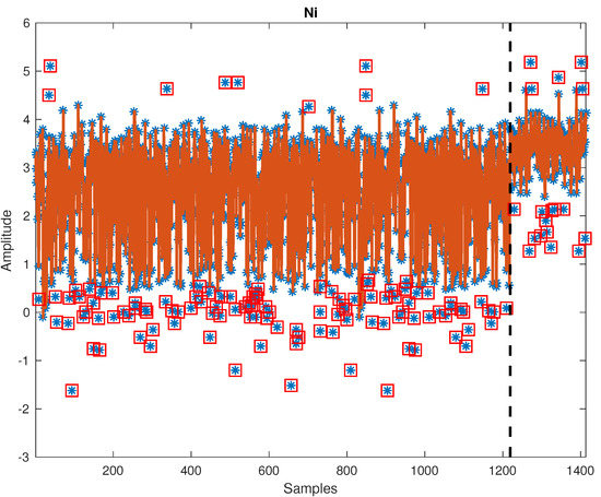 Figure 5 displays raw training of the sediment data set. There are obvious mean shifts in variables like Cd, Cu, Ni, Ag, and Zn. Figure 6 and Figure 7 show cleaning results by PELT-TSKF on Cd and Ni data set. The new method is able to detect abnormal observations highlighted in red squares and find the mean shift points marked by black dash lines. In Figure 6, there is still an outlier at around the 1300th point that the PELT-TSKF fails to detect, mainly because there are not enough normal data on the second stage to provide a good estimation of autoregressive models. As a result, the outlier detection performance is compromised.