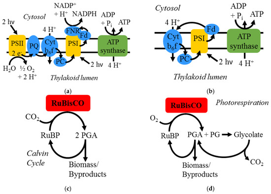 Figure 1. Light and dark reactions of photosynthesis. The role of photosystems I and II (PSI and PSII) in linear (a) and cyclic (b) photosynthesis and their relation to production of O2 and regeneration of NADPH and ATP. Linear photosynthesis produces O2 and regenerates both ATP and NADPH, whereas cyclic photosynthesis does not produce O2 and regenerates ATP only. In the dark reactions, the bifunctional RuBisCO enzyme can incorporate inorganic carbon into biomass via the Calvin cycle (c) or can react with O2 (d), resulting in a toxic byproduct and reducing incorporation of carbon into biomass. Abbreviations: hν, photons (photosynthetically active radiation); PQ, plastoquinone/plastoquinol; Cyt b6f, cytochrome b6f; PC, plastocyanin; FNR, ferredoxin-NADP+ reductase; Fd, ferredoxin; RuBP, ribulose-1,5-bisphosphate; PGA, 3-phosphoglycerate; PG, 2-phosphoglycolate.