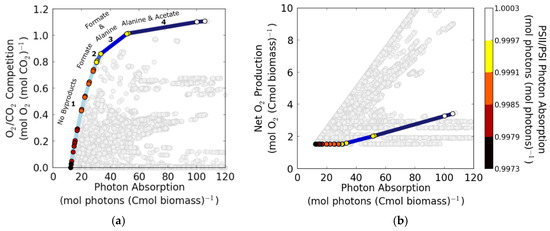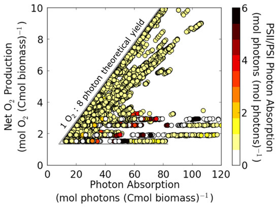 Figure 2. Computational analysis of irradiance and photosynthetic electron flow in cyanobacterium T. elongatus BP-1. Net O2 production (net mol O2 evolved (Cmol biomass produced)−1) is plotted as a function of photon absorption (mol photons absorbed (Cmol biomass produced)−1) for biomass-producing EFMs. Each point represents a unique EFM. The slope of the upper boundary of the phenotypic cone indicates maximum net moles of O2 produced per mole of photons absorbed (eight photons required per molecule O2 evolved; theoretical minimum quantum requirement). No byproducts were secreted on the lower boundary of the phenotypic cone minimizing net O2 production per biomass produced; net O2 production along this boundary was a direct result of electrons incorporated into biomass; secreted reduced carbon byproducts were predicted throughout the remaining phenotypic space. Color scale represents the photon absorption at PSII relative to PSI for each EFM (mol photons absorbed at PSII (mol photons absorbed at PSI)−1). Relative contribution of PSII was predicted to increase as photon absorption increased. Less than 1% of the EFMs had a PSII/PSI ratio greater than 6 (with maximal value of 20) and were excluded from the plot to represent a more feasible phenotypic space [67,68,69]. Modeled biomass production did not include maintenance energy requirements. Points in the plot area shown are representative of 4,371,798 EFMs.