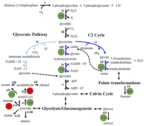 Figure 6. Cyanobacterium T. elongatus BP-1 photorespiration and byproduct secretion pathways with transcriptomic data measured under high versus low irradiance. Genome-based photorespiration routes (C2 cycle, dark blue, and glycerate pathway, light blue) and byproduct secretion pathways included in the BP-1 model are illustrated. Green circles represent upregulated gene expression measured under high irradiance (2000 versus 200 μmol photons m−2 s−1), and red circles represent downregulated gene expression, previously measured in [33]. Numbers indicate fold change for each gene. Enzymes coded in Roman numerals are: i, ribulose-1,5-bisphosphate carboxylase oxygenase; ii, phosphoglycolate phosphatase; iii, glycolate oxidase; iv, glyoxylate carboligase; v, tartronate semialdehyde reductase; vi, glycine transaminase; vii, serine hydroxymethyltransferase; viii, serine-glyoxylate transaminase; ix, glycerate dehydrogenase; x, glycerate 3-kinase; xi, acetaldehyde dehydrogenase; xii, alcohol dehydrogenase; xiii, succinate-semialdehyde dehydrogenase; xiv, acetyl-CoA synthetase; xv, pyruvate dehydrogenase; xvi, formate acetyltransferase; xvii, lactate dehydrogenase; xviii, alanine dehydrogenase; xix, sucrose phosphate synthase and sucrose phosphate phosphatase; xx, formyltetrahydrofolate deformylase. Other abbreviations: αkg, α-ketoglutarate.