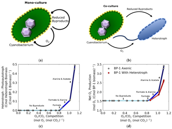 BP-1 acclimation to a variety of culturing stresses was predicted to result in secretion of reduced carbon byproducts including organic acids and amino acids (Figure 3a and Figure A2a,b; illustrated in Figure 7a). These byproducts represent a nutritional niche for heterotrophs. Photoautotrophic-heterotrophic cross-feeding could represent a mutually beneficial mechanism for buffering a photoautotroph from environmental stresses. Consumption of reduced carbon byproducts by the heterotroph would relieve potential inhibitory organic acid stress, as well as maximize the efficiency of total resource usage by the community (illustrated in Figure 7b). Cross-feeding of byproducts could also promote growth of the photoautotroph through consumption of O2 by an aerobic heterotroph, thus decreasing local O2 concentrations and lowering O2/CO2 competition. The amount of heterotroph able to be supported by secreted byproducts was predicted as a function of stress using published heterotrophic biomass per byproduct yields [76,77,78,79,80,81,82] (Figure 7c, see File S5 in the Supplementary Materials for calculations). The predicted amount of heterotrophic biomass that can be supported by BP-1 through cross-feeding of byproducts increased as stress increased due to higher byproduct yields at higher stress levels, as well as the varying heterotrophic biomass yields on different byproducts (Table A4 in Appendix C). The cross-feeding was also predicted to reduce local O2 levels, which was calculated based on heterotrophic biomass O2 requirements (Figure 7d, File S5 in the Supplementary Materials).