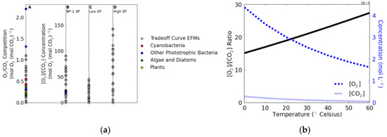 Figure 8. Comparison of computational and experimental O2/CO2 competition and concentrations at RuBisCO. (a) Predicted O2/CO2 competition values (mol O2 (mol CO2)−1 consumed at RuBisCO) from the irradiance tradeoff curve in Figure 3a are shown in gray (A). Experimental O2/CO2 values for a variety of organisms calculated at air equilibrium and 25 °C [88] are overlaid in color. Predicted O2/CO2 competition values (gray points) were converted to relative O2/CO2 concentrations around RuBisCO by multiplying by the specificity factor (SF). The experimentally measured SF for BP-1 of 82 [87] was used for conversion in (B). Experimental data points from Falkowski and Raven (colored points) were converted to O2/CO2 concentrations via the respective SF of each organism [88]. Comparison of the BP-1 SF with lower and higher SF values is visualized using a lower SF of 41 (representative of Synechococcus sp.) (C) and a higher SF of 129 (representative of a red alga) (D). A lower SF indicates that lower relative O2/CO2 concentrations result in higher O2/CO2 competition ratios, whereas a higher SF indicates that an organism is more tolerant of higher relative O2/CO2 concentrations. (b) Temperature affects the relative propensity of RuBisCO for oxygenation. Dashed and dotted blue curves represent O2 and CO2 concentrations in aqueous phase at equilibrium with atmospheric concentrations, calculated using Henry’s law constants from Sander [96]. The black curve represents the ratio of the [O2] to [CO2] curves, showing that the relative proportion of O2 increases with elevated temperature. Calculations are provided in File S6.