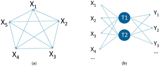 As referred to in the introductory section, IPM has undergone several trends that reflect the need to adapt to increasingly complex scenarios of processes to be monitored and data to be handled. The prevailing focus in this endeavour has been to achieve the best detection performance possible, as the challenges become more demanding. This includes the mainstream of univariate and multivariate statistical process monitoring methods, which are based on the adoption of a certain probabilistic model structure that is flexible enough for describing the NOC behaviour for a wide class of industrial processes. These general purpose approaches typically do not require specific information about the process structure, other than the parameter estimates of the NOC model that are obtained from process data during Phase 1 analysis [,]. Examples include the celebrated Shewhart, Exponentially Weighted Moving Average (EWMA) and Cumulative Sum (CUSUM) control charts based on the univariate i.i.d. Gaussian model [,,], which can be leveraged to a large class of static processes upon the use of sample means, as a consequence of the Central Limit Theorem. Also included are their multivariate extensions that consider NOC behaviours consistent with an m-dimensional i.i.d. Gaussian process, namely the Hotelling’s T2 chart [], the Multivariate Exponentially Weighted Moving Average chart (MEWMA) [] and Multivariate Cumulative Sum chart (MCUSUM) [], as well as the high-dimensional methodologies based on PCA and PLS [,,,]. These last two approaches belong to the class of latent variable monitoring approaches, and have achieved high levels of success and acceptance in both academia and industry. Their model structures present elements more consistent with the nature of industrial processes operating under normal conditions. Figure 2 presents the model structures implicitly considered in multivariate and latent variable process monitoring approaches, where their acausal nature and assumed distinct inner mechanisms become clear. In particular, multivariate methods tacitly consider the variability drivers to be observable, presenting different levels of correlation. On the other hand, latent variable frameworks assume that the observed variability in the collected measurements is driven by a few underlying and unobservable quantities, which are responsible for their variation (raw materials, environmental conditions, machines, operators, etc.). The last description resonates well with what happens in industrial units operating under NOC scenarios, which motivates the adoption of latent variable tools to handle problems in these settings.