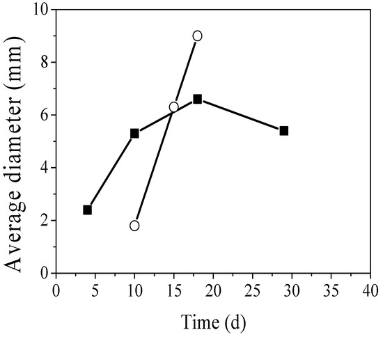Average diameter of biomass in SBR I (○) and SBR II (■).