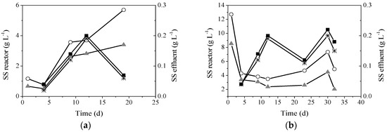 The initial volatile suspended solids (VSS) concentration of SBR I was of 0.7 g VSS L−1 and increased up to 3.4 g VSS L−1 on day 19 (Figure 3a). In SBR II, the solids concentration decreased from 8.5 g VSS L−1 to 3.4 g VSS L−1 on day 9 (Figure 3b). The biomass concentration increased slowly up to 4.0 g VSS L−1 and finally, diminished down to 1.8 g VSS L−1 on day 32.