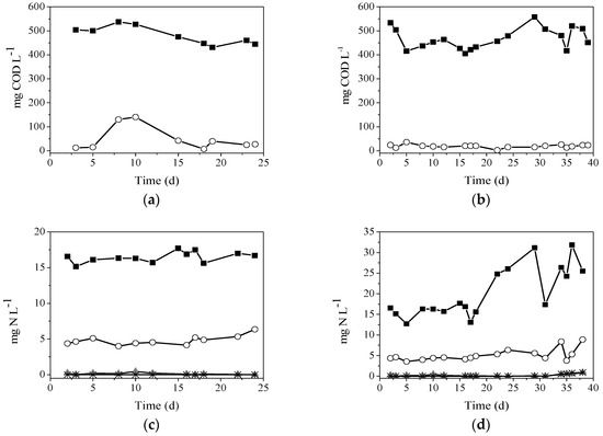 (a,b) COD concentrations in the influent (■) and effluent (○) in SBR I and SBR II, respectively. (c,d) Influent NH4+-N concentrations (■), effluent NH4+-N (○), NO2−-N (*), and NO3−-N (▲) in SBR I and SBR II, respectively.