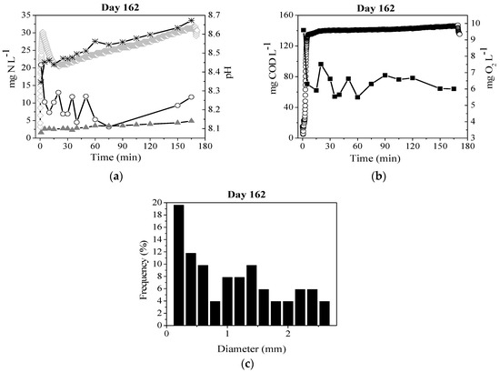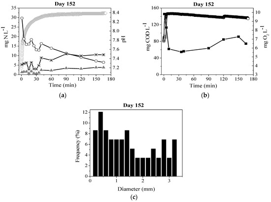 Cycle prolile on day 152 with aeration rate of 1.26 cm s−1. (a) Nitrogen compound concentrations and pH: N-NH4+ (○), N-NO2− (*), N-NO3− (▲), and pH (◊); (b) O2 concentration (○) and soluble COD (■); (c) Granule size distribution.