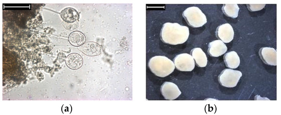 (a) Inoculum by activated sludge in SBR I. The bar represents 50 μm. (b) Inoculum by aerobic granules in SBR II. The bar represents 2 mm.