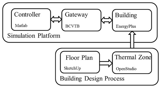 A conceptual flow diagram showing the entire simulation platform design process, including the building design step, as well as the control simulation platform step.