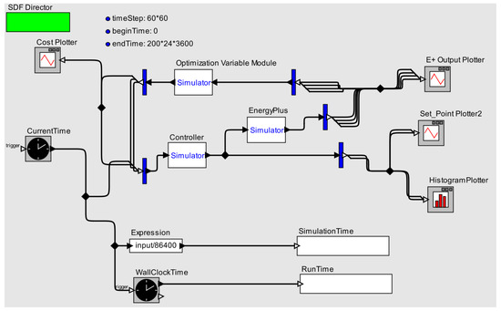 Figure 2 shows the control platform developed. A custom Building Controls Virtual Test Bed (BCVTB) co-simulation allows for communication between building simulation in EnergyPlus and the controller module in MATLAB. An optimization variable module is added to receive raw data from EnergyPlus and computes the optimization cost. In the figure, blue bars are for splitting output vector streams into individual multi-line vector streams, which can then be plotted in the various plotters implemented.