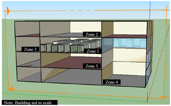 3D model of our simulated office building zone in SketchUp. Zone 1 is the simulated zone, with Zones 2–5 acting as adjacent, ideal air zones.