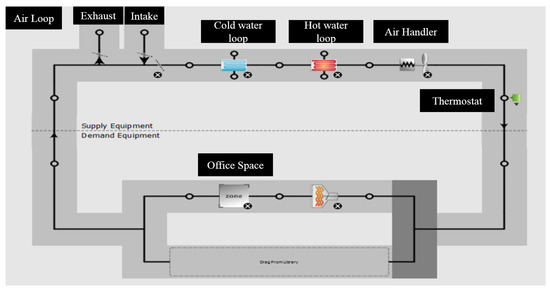 During the building design process, using OpenStudio 2.1.0, we also utilized SketchUp 2016 with OpenStudio to specify the space’s internal HVAC loop, an isolated single thermal zone with a simple Variable Air Volume (VAV) HVAC loop, consisting of heating/cooling elements, air blower fans and a generic thermostat. See Figure 4.