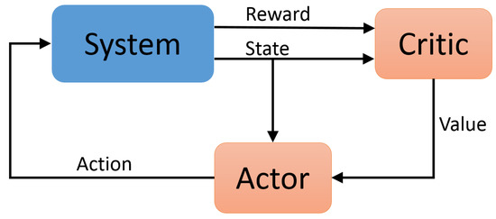 A high-level block diagram of the actor-critic reinforcement learning architecture is shown. This shows the general flow of state observations and reward signals between the algorithm and the environment, the critic’s update and its value estimate, which is used by the policy in it’s policy gradient updates.