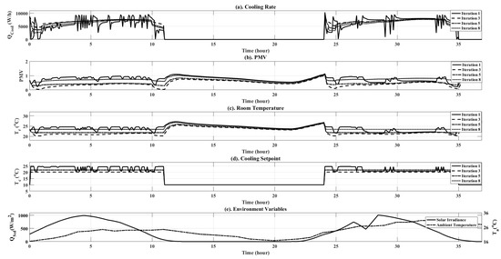 The RL controller was trained using two days of simulation data with a sampling time of 5 min. Figure 9 shows the RL controller’s trajectories across each iteration of training. It can be observed that initially, the controller’s output contains large variation, as clearly observed in the cooling rate . With each training iteration, the controller outputs stabilize, until they stabilize to the optimal controller output with low overall cost.