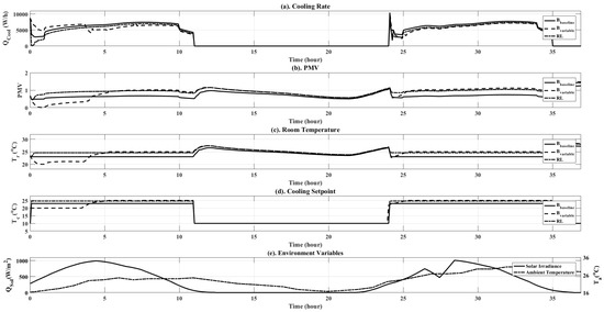 The iterative tuning of the RL controller is performed on identical datasets. In order to evaluate the effectiveness of the RL controller, a five-day window, with weather data pertaining to five contiguous days, is utilized. These five days are not contiguous with respect to the training days; however, they are from the same season as the training data (summer), with slow-varying cloud cover and ambient temperature. The weather pattern provides cloud cover on Days 4 and 5, as observed in Figure 11 from the low solar irradiance and ambient temperature conditions. It is observed that the RL controller positions the cooling setpoint () slightly above the controller. As observed from the cooling rate in Figure 11, it is evident that this enables a slightly lower cooling of the office thermal zone while leading to improved energy efficiency at the cost of acceptable thermal comfort loss. The average thermal comfort of the is 0.708 and that of variable control is 0.917. The RL controller has an average thermal comfort of 0.775, improving the thermal comfort by 15.5% over the and driving down energy by 5.03% as compared to the controller.