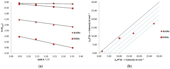 (a) van’t Hoff plots of ln (Kmim) vs. 1/T for mim in a systems [C4C1im]Cl/organic solvent; (b) Relationship between the enthalpic and entropic terms of transfer functions from [C4C1im]Cl to solvent for N-methylimidazole at 298.15 K. The isoenergetic curves of ∆trG0 function are marked by dotted lines.