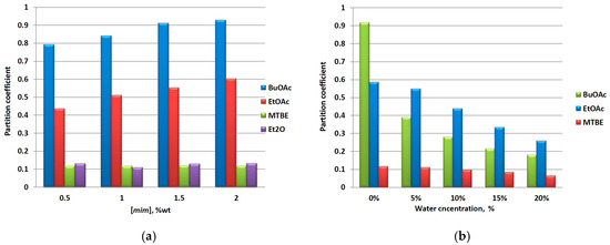Another factor that might change the ILs’ properties is the presence of water [13,14]. To study the influence of the water content in ILs, we measured the partition of mim by using BuOAc, EtOAc, and MTBE as organic solvents. As can be seen from Figure 2b, Kmim decreases with the increase of water concentration for the three solvents used, and this phenomenon has a reverse relationship to the extraction ability of the latter. The observed effect is most pronounced for the BuOAc (80% reduction), best performed under “dry conditions”, and less pronounced for MTBE (45% reduction) upon increasing the water content from 0 to 20% (wt/wt). It is also noteworthy that the presence of even 5% of water changes the order of the solvents’ ability to extract mim; consequently, the water content can be considered as a factor of an immense importance that controls the mim partition in a significant manner, and that the use of a dry solvent is preferred in the purification of ILs.