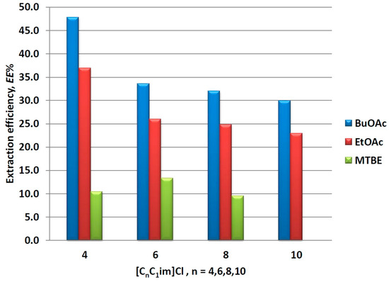 Changing the alkyl chain length in the ILs ions can be considered a direct way to tune their hydrophobic properties [54,55]. 1-Alkyl-3-methylimidazolium chlorides with alkyl chain lengths varying from 4 to 10 were chosen to conduct a preliminary study on the influence of that factor on the mim partition in IL/organic solvents biphasic systems. The corresponding experimental data is presented in Figure 3. It is noteworthy that the solubility of the organic solvents in ILs increases with the increase of the alkyl chain length, which causes deviation in the phase ratio solvent to IL, e.g., from 1:1 in the case of [C4C1im]Cl to 0.4:1.6 in the case of [C10C1im]Cl when BuOAc or EtOAc were used as organic solvents. Furthermore, MTBE was completely soluble in [C10C1im]Cl at a mixing ratio of 1:1. Therefore, for comparison purposes, the results are presented and discussed in terms of extraction efficiency (EE%), the latter being defined as: EE% = [Kmim/(1 +1/RV)] × 100, thus taking into account the apparent phase ratio RV.