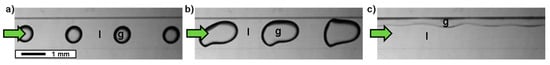 Experimentally observed gas–liquid flow regimes in millichannel (1.0 × 1.0 mm) upstream of the micronozzle. Arrows indicate direction of flow. Gaseous phase is marked with “g”, liquid phase with “l”. (a) Bubbly flow at = 15%, = 40 mL/min; (b) slug flow at = 25%, = 40 mL/min; (c) parallel flow at = 40%, = 60 mL/min.
