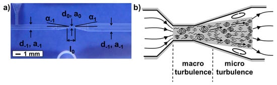 Thus, depends on the geometry of the turbulence generator (hydraulic diameter , length , and height of smallest cross section) and the downstream channel depth . Characteristic nozzle parameters are given with respective angles ( and ), hydraulic channel diameters (, and ), aspect ratios (, and ), and length of the smallest cross section. The index “−1” is linked to the converging inlet nozzle region, index “0” indicates parameters in the smallest cross section, and index “1” relates to parameters of the diverging outlet nozzle part. This is shown in Figure 2 next to a turbulent field of single-phase liquid flow in the diverging nozzle section.