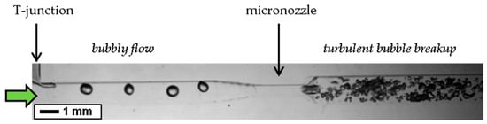 The intensity of bubble breakup behind micronozzles is strongly affected by energy dissipation rates, which depend on nozzle-induced pressure drop [13]. Once external forces surpass the bubble-stabilizing Laplace pressure, the mother bubble is broken up. Various micronozzle-induced bubble breakup regimes have been identified and related breakup mechanisms have been proposed in fundamental studies [36,37]. Laminar breakup regime is characterized by binary breakup or the shearing off of small daughter bubbles at the rear cap of the mother bubble at moderate flow rates and energy dissipation rates. Rather large daughter bubble diameters are prominent and a broad daughter bubble size distribution is obtained, often featuring a bimodal shape. Turbulent bubble disruption is obtained at higher flow rates, which results in increased energy dissipation rates due to larger pressure drops across the micronozzle. Therefore, large energy input is needed, leading to the generation of interfacial area. The mother bubble is broken up into numerous daughter bubbles of similar size and a unimodal and narrow daughter bubble size distribution is obtained at smaller mean bubble diameters. Furthermore, observations of internal jet flow formation within bubbles have been made, which can be used for bubble breakup, too [38].