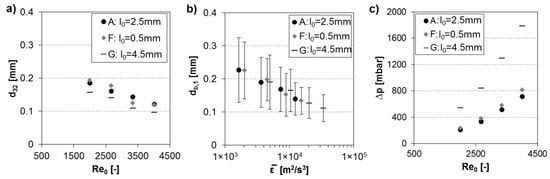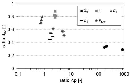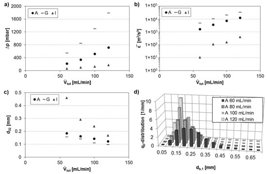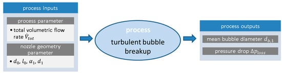 To begin with process inputs, process outputs, and potential disturbance variables, which would falsify the results, have to be specified. According to the aim of the study, the mean daughter bubble size is the process output of particularly high interest as the interfacial area increases to the power of a third during the breakup of a mother bubble into numerous small daughter bubbles. Since the energy input needs to be low at the same time, the pressure drop is the other process output of interest. The energy dissipation rate depends on the pressure drop according to Equation (7) and it is linked to the bubble breakup.