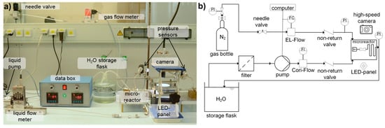 A rectangular channel ( = 5 mm and = 1 mm) is milled into the upper side of the reaction plate downstream of the nozzle element. Two outer flanges press a view glass onto the upper side of the reaction plate to assure the watertightness of the channel. At the same time, the highly transparent polymethylmethacrylate (PMMA) plate and view glass, in combination with a light-emitting diode (LED) panel that is placed below the microreactor, allow for optical observation of the bubble breakup by a high-speed camera from above. The entire experimental set-up (a) and a flow chart (b) are displayed in Figure 6.