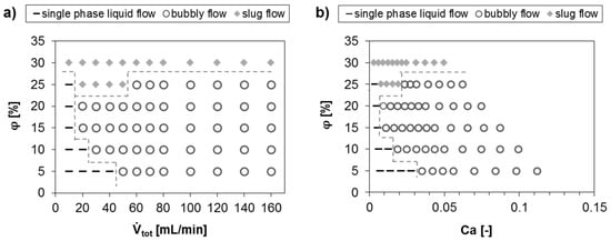 Single-phase liquid flow is obtained at small total volumetric flow rates and low void fractions according to Figure 7a. Minimum volumetric gas flow rate with the gas flow meter is = 3 mL/min. At increased flow rates, bubbly flow is obtained for void fractions < 20%. Here, the liquid phase rapidly entrains bubbles at the T-mixer and bubbles are generated in a dripping regime. Accordingly, capillary numbers are in the range of 0.01 < < 0.1, see Figure 7b. This matches the literature data well [48]. For bubbly flow, shear stress caused by the continuous phase drove and collapsed the gaseous thread. Values of > 20% quickly lead to a transition from dripping to squeezing regime and from bubbly to slug flow pattern. At = 30%, exclusively slug flow is found in the investigated range. Here, pressure in the obstructed liquid phase is the main driver for bubble generation. Comparably high gaseous flow rates result in complete filling of the main channel by the gaseous phase. Surface tension is prominent, indicated by small numbers. The shear stress caused by the liquid phase to the gaseous thread is significantly smaller than the surface tension force in slug flow.