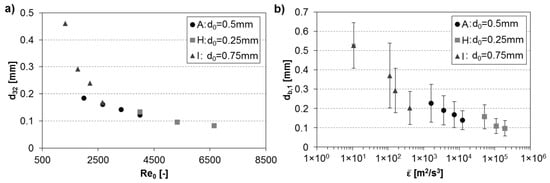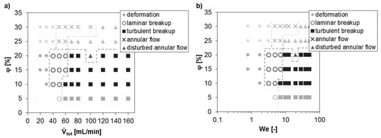 A breakup regime map is produced using nozzle inlay A to specify an operating window for turbulent bubble breakup behind the micronozzle. Since the potential operating window for the process parameters has been reduced by primary bubble generation, the main focus is on the process parameter region selected in Section 3.1.1. A bubble breakup map for total volumetric flow rate is shown in Figure 8a and dependencies on the dimensionless number in Figure 8b.