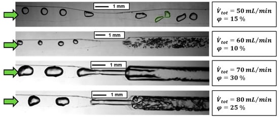 Turbulent bubble breakup starts at total volumetric flow rates of 60 mL/min and is observed throughout for higher flow rates. A critical number, marking the transition from laminar to turbulent breakup, is found for the ≈ 7–9 range depending on flow rate and void fraction. Related number is in the range of ≈ 2300–2660 depending on void fraction. The literature data show similar [62]. Consecutive incoming bubbles coalesce within the smallest cross section of the nozzle at high gaseous volumetric flow rates and void fractions > 20%. Here, two other regimes are observed. Annular flow is obtained behind the micronozzle starting at ≈ 6 and related ≈ 1600. In case of further increase of the liquid flow rate, disturbed annular flow is observed, which nicely displays turbulent eddies at > 10–12 and related ≥ 2660–3660 depending on . The observed breakup and flow regimes behind the micronozzle are shown in Figure 9.