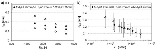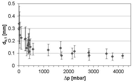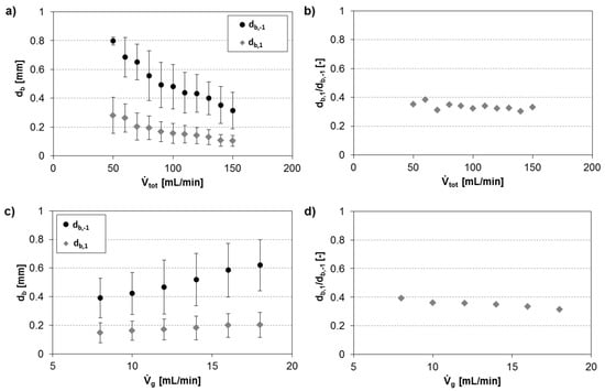 Bubble generation is a highly dynamic process, especially in dripping mode and resulting bubbly flow. Consequently, bubbles of slightly varying size can be generated at the same time. This raises the question of whether the primary bubble size has a significant influence on the size of the daughter bubbles. According to Equation (5), smaller bubbles feature higher Laplace pressures. It is likely that smaller mother bubbles cannot be broken up as easily as comparably larger mother bubbles. In order to determine the influence of primary bubble size on the daughter bubble size, further preliminary experiments are carried out. In a first experimental series, the void fraction = 10% is held constant and the total volumetric flow rate is varied in the range of 50–150 mL/min. The second experimental series is carried out at constant liquid flow rate = 100 mL/min and varied gas flow rate in the range of = 8–18 mL/min. Results are shown in Figure 10a,b, respectively. Figure 10a shows that mother bubble size and daughter bubble size decrease at increasing total flow rates. On the one hand, increased total flow rate leads to a more rapid entrainment of the bubbles during formation. On the other hand, an increased number behind the micronozzle entails a higher degree of bubbly flow refinement. Standard deviations are prominent for mother and daughter bubbles, since bubble generation is a highly dynamic process. Interestingly, daughter bubbles show smaller standard deviations than mother bubbles, which means the bubble size distribution is narrower. Figure 10b shows a rather constant level of mother and daughter bubble size ratio. A slight decline can be seen with a closer look. Accordingly, smaller bubbles are disrupted nearly in the same ratio as larger mother bubbles. This can be explained by the rise in pressure drop; hence, energy dissipation is induced by the micronozzle at higher flow rates. Consequently, mother bubbles are harder to break up due to increased Laplace pressure. However, more energy is available for the bubble breakup behind the micronozzle at the same time. The slope of a linear trend line for the ratios in Figure 10b is determined as = −0.0004 min/mL. This indicates that the Laplace pressure rises marginally faster than the energy dissipation rate. Nonetheless, the effect is negligible, especially in the range of interest for 80 mL/min < < 120 mL/min.