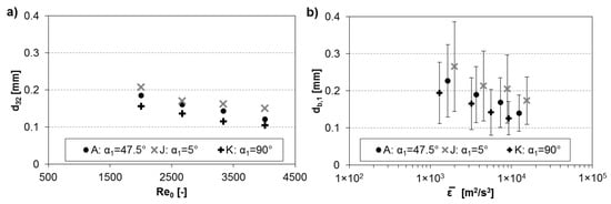 Bubble diameter measurement is done with open-source image processing software ImageJ v1.51d (National Institutes of Health, Rockville, MD, USA) for characterizing the dispersions. A known reference length is taken to translate pixels to real length. To obtain reliable data and defined bubbles, pixel errors and miniature bubbles are filtered. Serving as exclusion criteria, 0.05 mm in minimum bubble size is introduced. Since the pictures show a 2D view from above instead of a 3D view, bubble diameters have to be determined carefully. Bubble diameters are derived from the mean Feret diameter, projection area of the respective bubble, and bubble perimeter. An average of the three values is determined and employed as the representative mean bubble diameter. In order to provide an adequate statistical basis, experiments are performed in triplicate and 600 bubbles are analyzed per experiment, resulting in 1800 bubbles per experimental point. Therefore, resulting standard deviations are shown in the diagrams as bubble breakup in fluctuating jet flow shows a certain distribution. Finally, size and density distributions are obtained with [45]