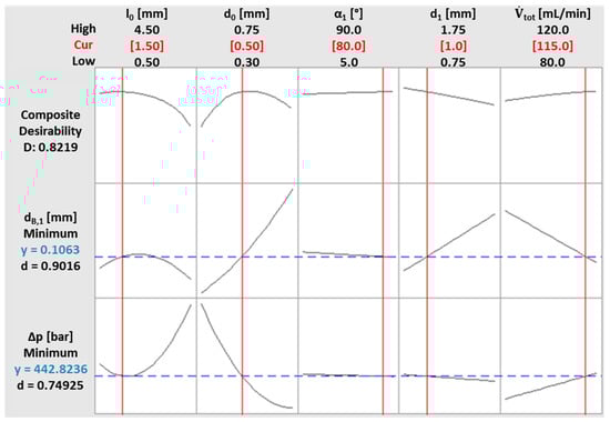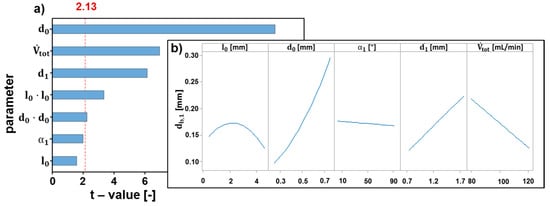 In order to create the DoE, suitable ranges for process inputs have to be determined. The operating range of 80–120 mL/min is selected for the total volumetric flow rate . Preliminary experiments showed bubbly flow and turbulent bubble breakup upstream and downstream of the nozzle, respectively. The hydraulic diameter of the smallest cross section is varied between 0.75 mm and 0.25 mm. The dimensions of the upstream channel give the upper limit, since the nozzle diameter has to be noticeably smaller than the upstream channel. The lower limit is determined by pressure drop as it reaches high values, if combined with other extremes of the remaining parameters. The length of the smallest cross section was found to be in the range of 0.5–4.5 mm, as the upper limit results from a lack of space in the channel arrangement to investigate even longer nozzles. The nozzle’s outlet angle is investigated in the region of 5–90°. The smaller angle is the limit at which jet flow is observed [39], while 90° is the largest reasonable angle. Finally, the hydraulic diameter of the downstream channel is varied between 0.75–1.75 mm. Table 2 sums up all five parameters and their investigated ranges, which are included in the DoE.