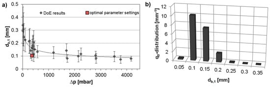 This section starts with a brief overview of generated flow maps. The selected parameters’ qualitative effect regarding turbulent bubble breakup and pressure drop is evaluated in Section 4.2 Subsequently, the results of the DoE are presented and models for daughter bubble size and pressure drop are derived. Parameter optimization regarding energy-efficient turbulent bubble breakup is carried out. Finally, a micronozzle featuring an optimized parameter setting is manufactured, tested, and compared with obtained models.