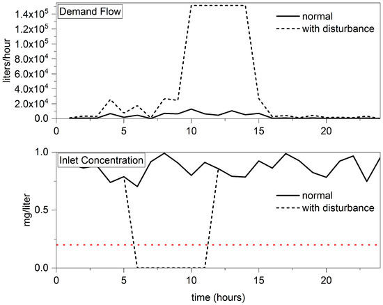 Simulated disturbances used in this study for demand and inlet concentration. The red dotted line at 0.2 mg/L signifies the lower limit of system chlorine concentration allowed to ensure a potable water supply.