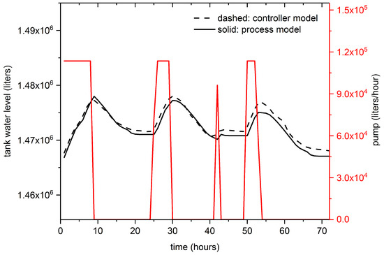 Comparison of tank water volume predicted by the distributed modeling (solid) and the transfer function models shown in Table 1 (dashed). The solid red line, referenced to the right y-axis, depicts scheduled and unscheduled pumping by the controller.