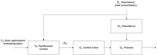 The “control calcuations” block in Figure 6 is made up of the feedforward and feedback loops in Figure 7 and Figure 8. The optimization/scheduling layer provides set points to the control loops based on the model’s prediction and inputs on the system such as electricity prices, predicted demand, and inlet concentration. Furthermore, the optimization/scheduling layer provides predictive pump scheduling for the system, which is shown as an input to the feedback control loop in Figure 8.