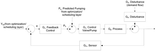 Block diagram for feedback control with included planned pumping from the optimization/scheduling layer. The control action is a portion of the “control calculations” block in Figure 6, modified from Seborg et al. [4].