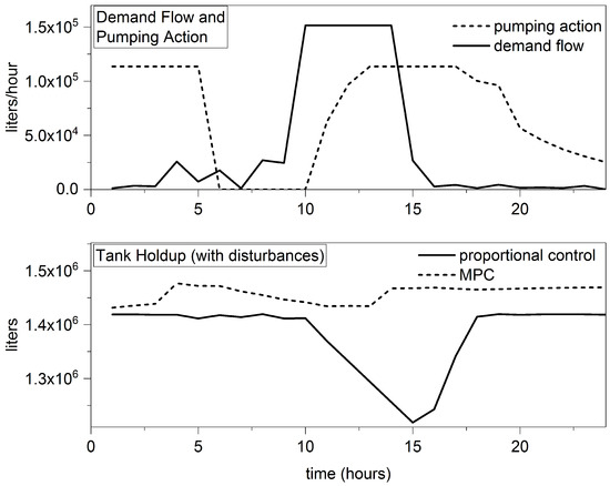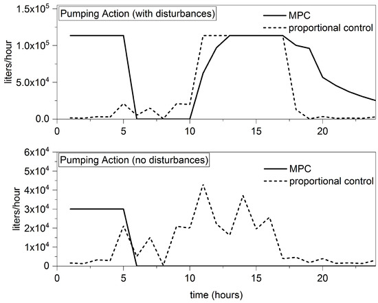 Comparison of pumping controlled by proportional control alone and model predictive control and how those strategies react to large disturbances.