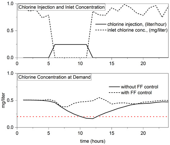 where is either the tank level set point, or the inlet chlorine concentration set point, and is the measured corresponding output values. The feedforward portion of the control phase is treated as “perfect” feedforward control, where the control action is designed to keep the controlled variable exactly at the set point despite dynamic effects from the system [4]: