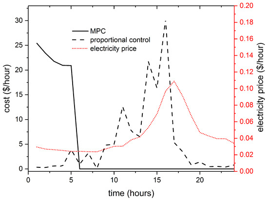 Cost of pumping over a 24 h period when proportional control and model predictive control are employed on the water system.