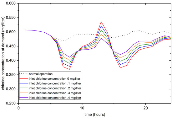 Large perturbations in municipal water systems are not unique to military bases, but the need to rapidly and accurately correct for disturbances is critical to base resiliency and safety. Resiliency on military bases is vulnerable to deficiencies in water systems created from a variety of disturbances: fires, terrorist activity, large leaks, or loss of chlorination at the inlet. Fires or large breaks in water lines caused by terrorist activity or other natural disasters, create an immediate and unpredicted demand that, without compensation, will quickly deplete water inventory. A large mechanized unit returning from training that requires intensive cleaning and maintenance could also put a similar stress on the water system. Figure 1 shows the physical location of perturbations used in this study at the inlet, or point where water is introduced to the system, and at the demand, which is modeled as a concentration of residential and industrial (military unit) consumers. Figure 2 shows plots of the relative disturbances. This study simulates a disturbance on demand, similar to the ones mentioned above, in the middle of the day when demand is already high. In the event of an extensive demand event, the flow of water required in the system would look more like the disturbance line in the upper plot of Figure 2. The line labeled “normal" depicts a standard day without excessive disturbances and a pattern of use that supports both residential and military operational needs. Typical system inlet chlorine concentration in this study ranges from 0.7–1.0 mg/L. The lower plot of Figure 2 shows a substantial disturbance on inlet concentration that, if not compensated for, would degrade water quality throughout the system and require extensive flushing that creates wasted water and energy. Such an event is a risk to the overall resiliency and security of base operations. Although these perturbations are only a fraction of the possibilities, they were chosen for this study to show the rigor of the proposed model predictive control (MPC) framework because they are large and occur when the system is under the most stress.