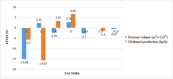 The studied responses were the methanol production and the reactor volume. The first response provides information about the productivity of the process, while the second response provides information about reactor and catalyst costs. A higher volume determines a higher catalyst mass and thus higher catalyst costs, in addition to higher reactor costs. It is preferable to have a higher productivity with lower costs. Figure 2 shows the results of ANOVA analysis: only significant factors and the values of their effects for the studied responses are reported. An effect can be considered as the variation of the analyzed response after the variation of the considered factor. In a positive effect, the increase of a factor produces an increase of response; in a negative effect, the increase of a factor produces a decrease of response. Meanwhile, in an interaction, the variation of two or three factors produces the variation (with a positive or negative effect) of response.