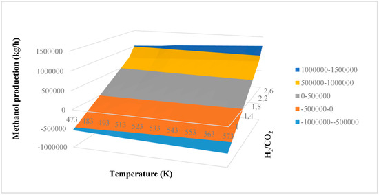 Comparing the results of two factorial designs, it is evident that only interaction AC allows the methanol production to be increased and the reactor volume and thus the catalyst mass to be decreased. A higher production is ensured with lower costs. In fact, upon increasing reaction temperature, both methanol production and reactor volume decrease. Increasing H2/CO2 ratio, the methanol production decreases but the reactor volume increases. Increasing recycling, the two analyzed responses increase. These solutions, then, are not suitable to improve the production of the system with lower costs. Only interaction AC ensures that the aim of this study is satisfied. Varying reaction temperature and H2/CO2 ratio, the methanol production increases, while the reactor volume decreases. This consideration can be observed in Figure 3a, where a surface plot of the methanol production in kg/h is obtained as a function of temperature and H2/CO2 ratio with a recycling equal to 30%. The plot is obtained considering the mathematical model of Equation (14). According to previous results and considering one factor at a time, the plot decreases when increasing reaction temperature, while it increases with increasing H2/CO2 ratio. The presence of an interaction between factors A and C is evident, where interaction AC has a positive effect. In fact, the plot does not have a linear pattern, underling the second-order nature of the interaction. It is possible to notice that only H2/CO2 ratios that are higher than 1.6 can be accepted in the process, because for lower ratios a negative methanol production is obtained by the mathematical model. In this way, it is possible to find the possible operating conditions of the reactor. Optimal operating conditions can be obtained at higher temperature and H2/CO2 ratio. Higher values of methanol production that can be obtained are in the range of 1,000,000–1,500,000 kg/h.