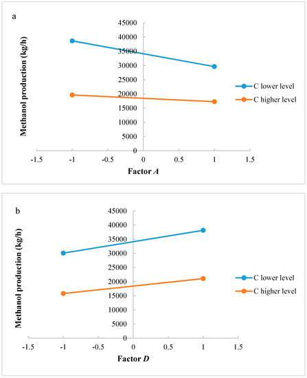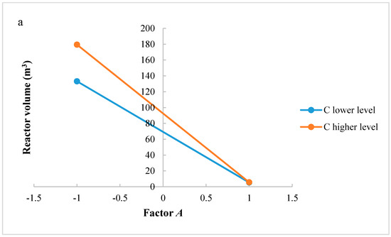The same considerations regarding the study of significant interactions could be carried out for the reactor volume. Figure 6a,b shows interactions AC and AD, respectively. In interaction AC, for factor A at higher level, an increase of H2/CO2 ratio does not improve the reactor volume. However, when factor A is at a lower level, H2/CO2 ratio increases the reactor volume. Interaction AC has a negative effect on the reactor volume: the positive effect of factor A decreases at the lowest level of factor C. In interaction AD, when factor A is at the higher level, an increase of factor D does not increase the reactor volume; in contrast, at lower level of factor A, a higher level of factor D determines a higher reactor volume. Interaction AD has a negative effect on the reactor volume: the positive effect of factor A decreases at the lowest level of factor D.