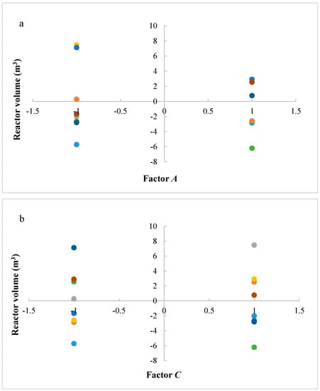Figure 7a–c shows residues versus the level of factors A, C, and D, respectively. Results show that a lower variability of the reactor volume is present with factor A at a higher level. In other cases, significant differences are not present. It is evident that a key interaction for the process is interaction AC: a higher productivity is ensured with a lower catalyst mass and reactor volume. In particular, it is preferable to work with factor A at a higher level and factor C at a lower level.