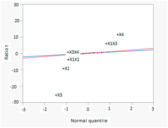 Figure 8 shows a normal diagram, in which the normality estimate of effects are shown: the statistical significance of both main and interaction factors are easily seen. Significant factors and interactions are evident, because they are far from the line. The slope of the blue line is the same of pseudo standard error, while the red line has a slope equal to 1. Factor X3 has the highest negative effect, but in interaction with factor X1 produces a significant positive effect. Other significant factors and interactions are X1, X1X1, X1X3, as reported in the mathematical model.